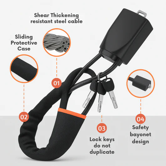 Lock it in 15 seconds, unlock in 5. No complicated setup, no instruction manual needed. Loop the cable through your steering wheel, click into the seatbelt buckle, pull tight, done. When you're ready to drive, one turn of the key and you're off. Simple enough for daily use, strong enough to stop thieves.